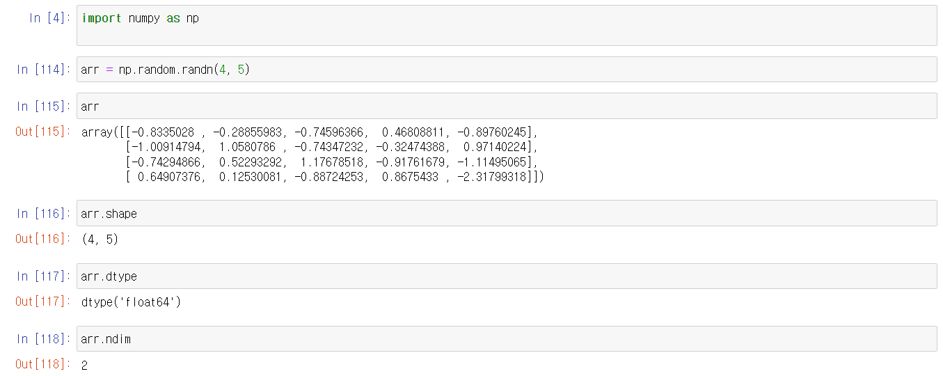 ndarray (n-dimensional array) : NumPy의 핵심이며, 빠른 배열계산이 가능하고 여러 수학함수를 제공한다.