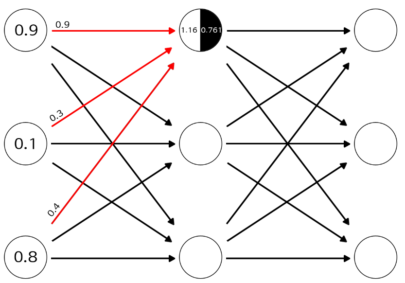 ( Sigmoid 함수 적용 : 1 / (1 + e^(-1.16)) ≒ 0.761 )