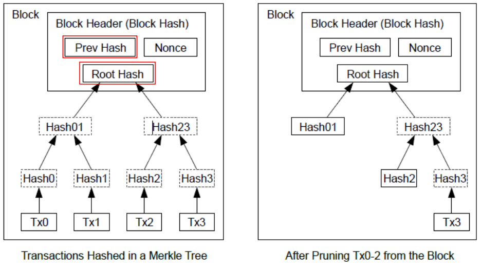 → Transaction 전체를 Hashing하는것이 아니라, 각각 Hashing하고 2개씩 묶어 다시 Hashing하는 방법으로 이루어짐.