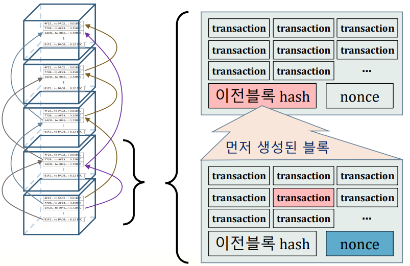 : 하나의 Block 내에 여러 Transaction과 Block Hash 값, 난수가 저장됨.